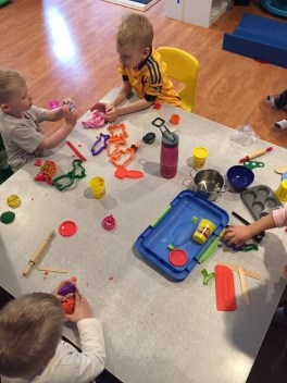 The big kids were excited when the play dough box came out! I really should get it out more often because they are so creative and there is a lot of learning that takes place at a play dough table. We have added the cookie cutter letters that comes with the MGT each month to help with the letter recognition. Z has discovered the Kids Youtube app. He really likes watching the product reviews that people put on there about new toys. Some of them show a “prize egg”. But it is a big plastic egg that is covered in scene or character made of play dough. So they are pretending to make them and guessing what was in them. Z also has some homemade flubber? I don’t really remember which gooey substance I made. But they are having a blast.